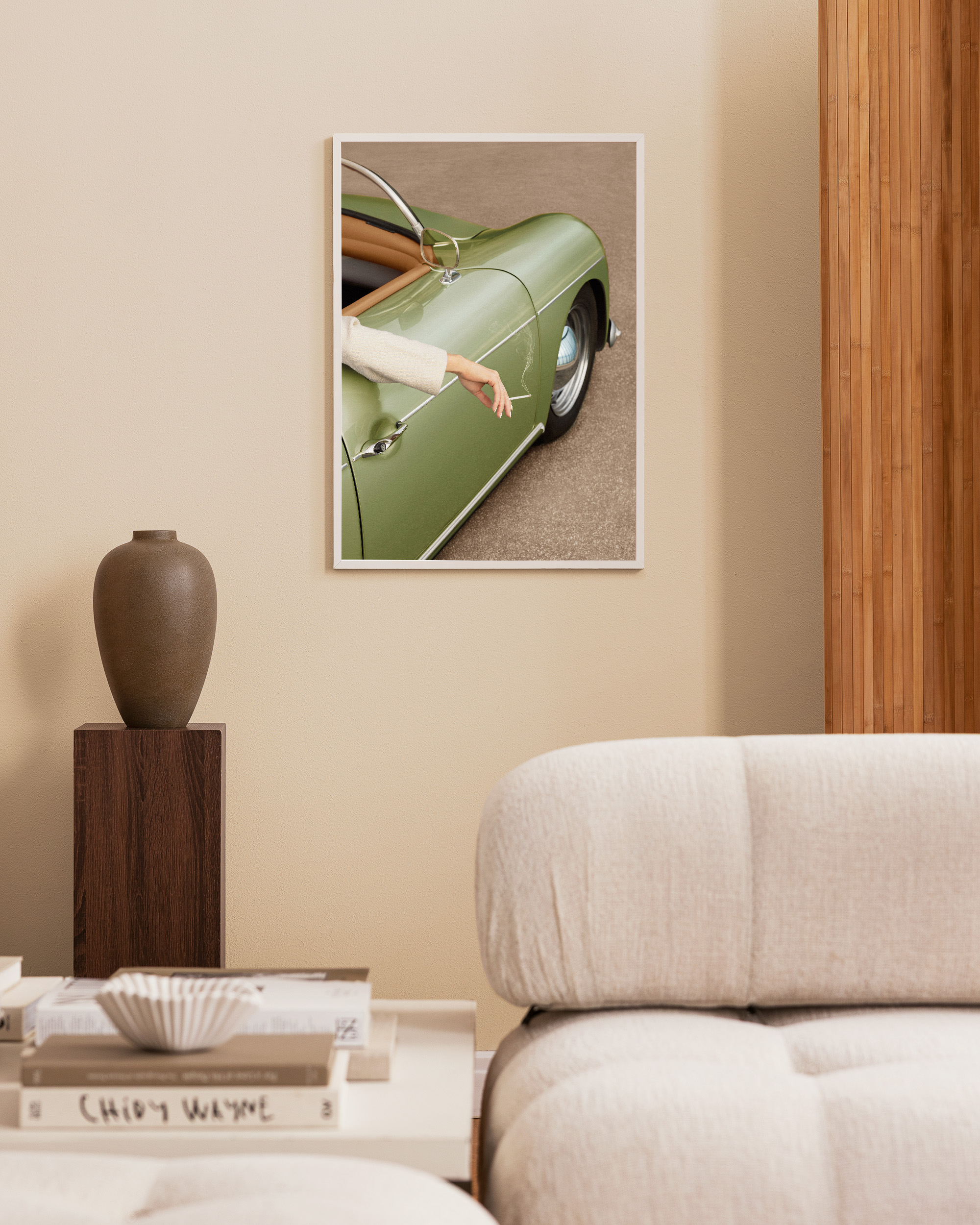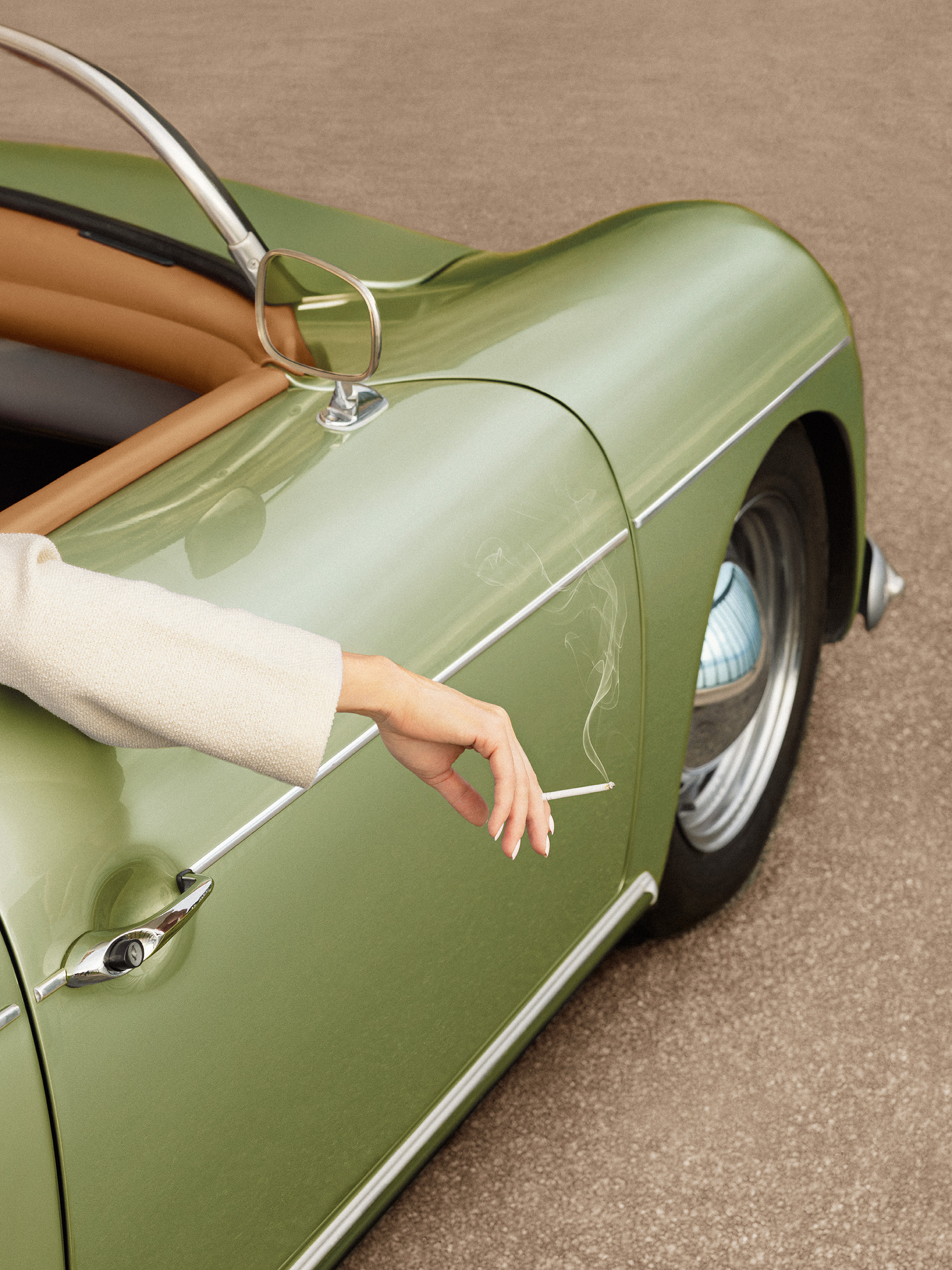 A vintage green car with a brown interior parked on textured ground. A person's arm rests on the door, holding a cigarette with visible smoke. Perfect print for car lovers!