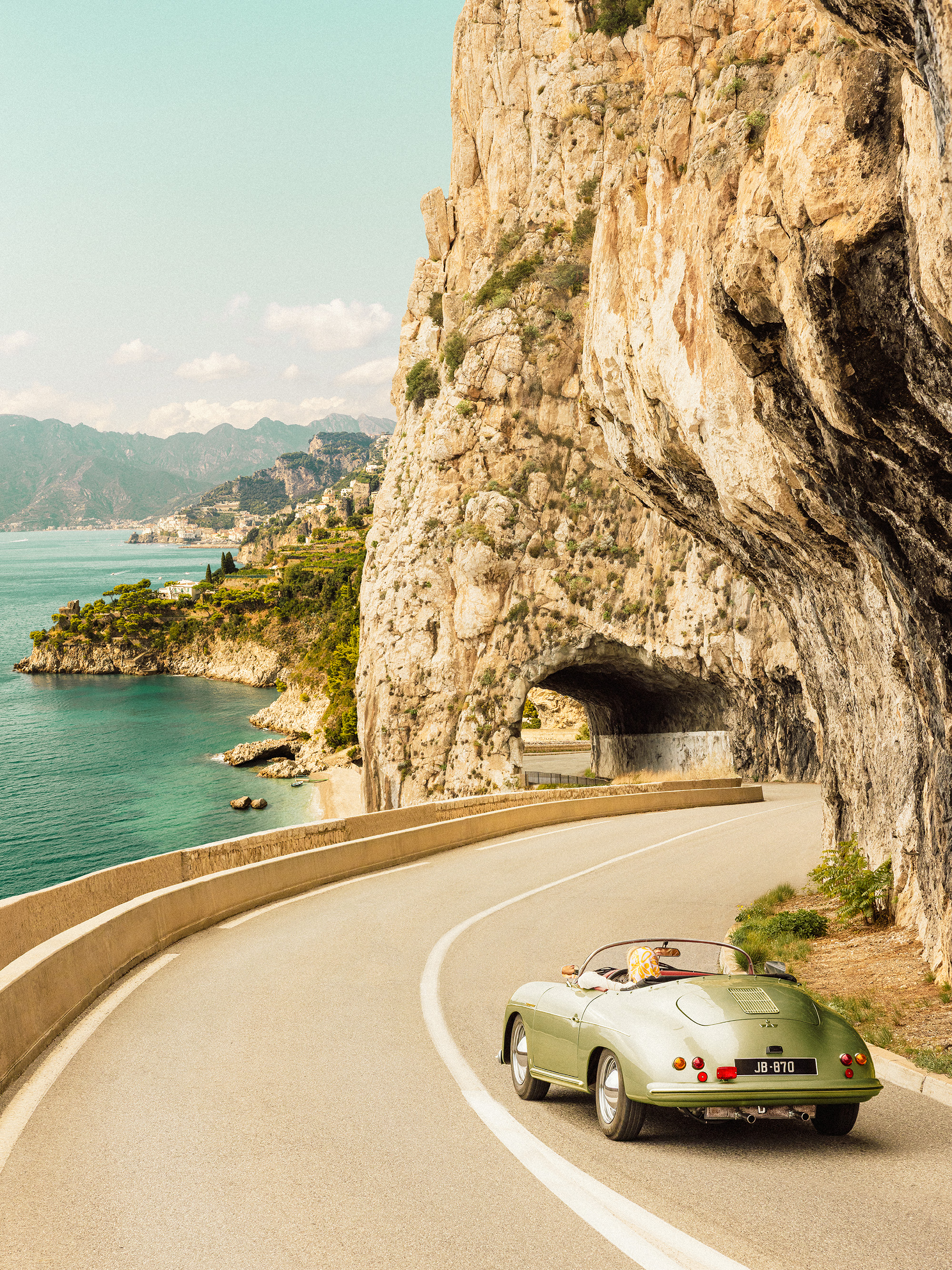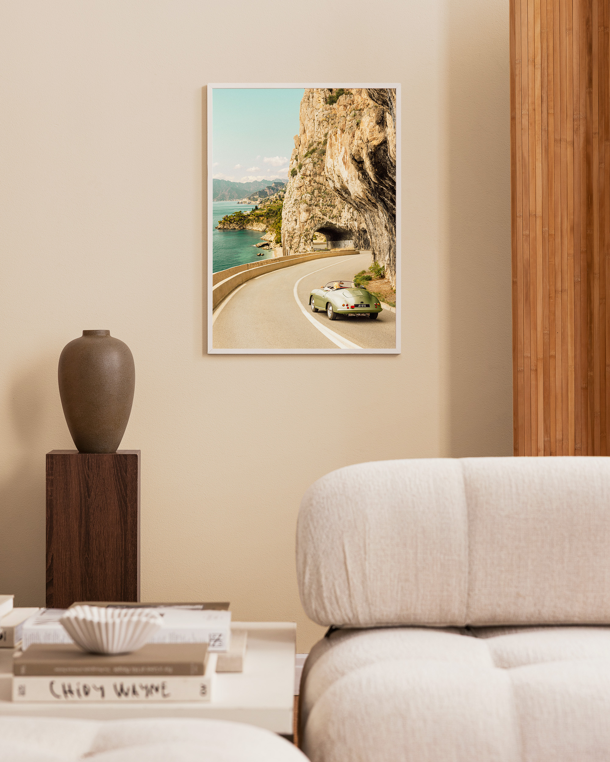 A print of a light green convertible car driving on a curvy coastal road surrounded by rocky cliffs and a bright blue sea.