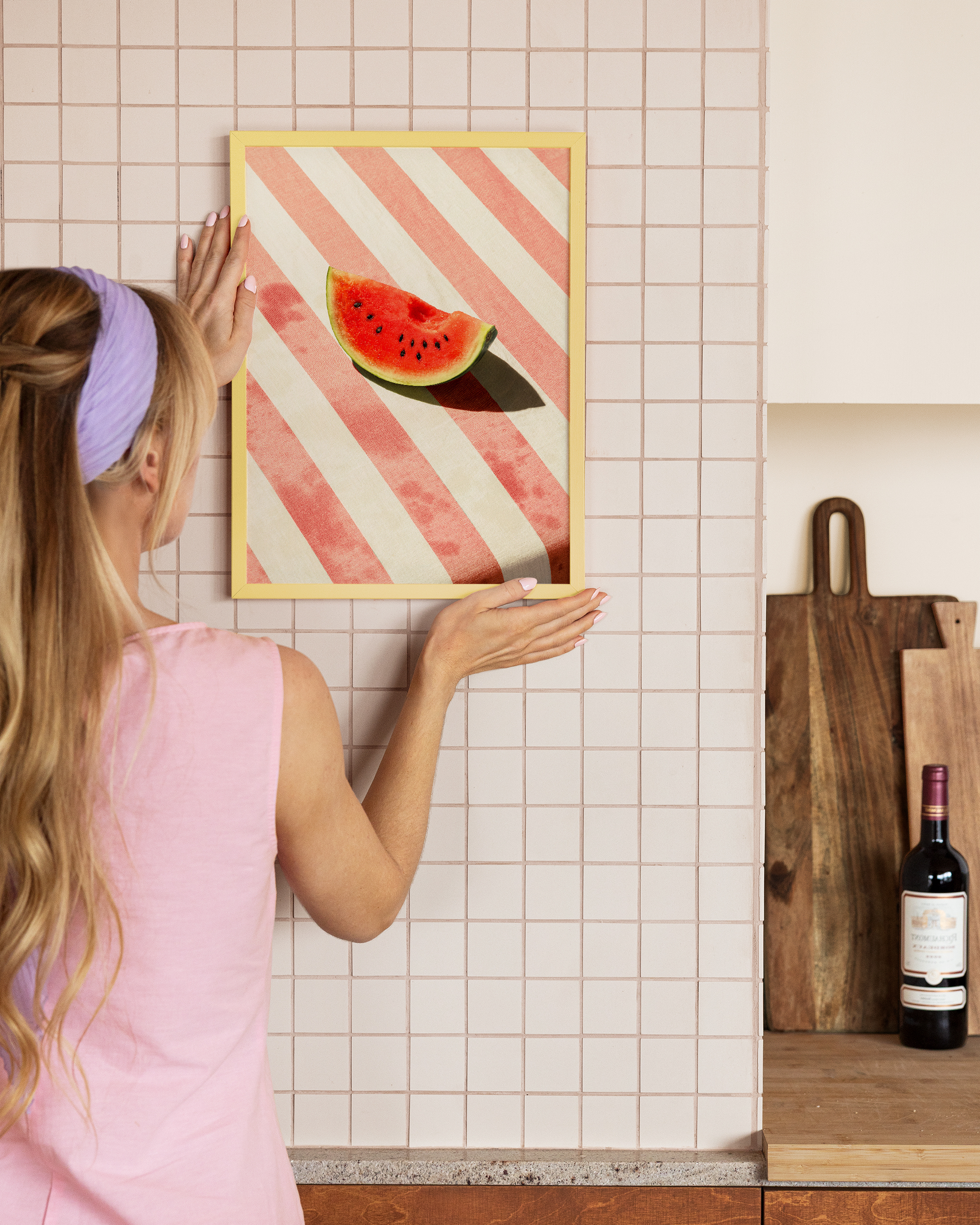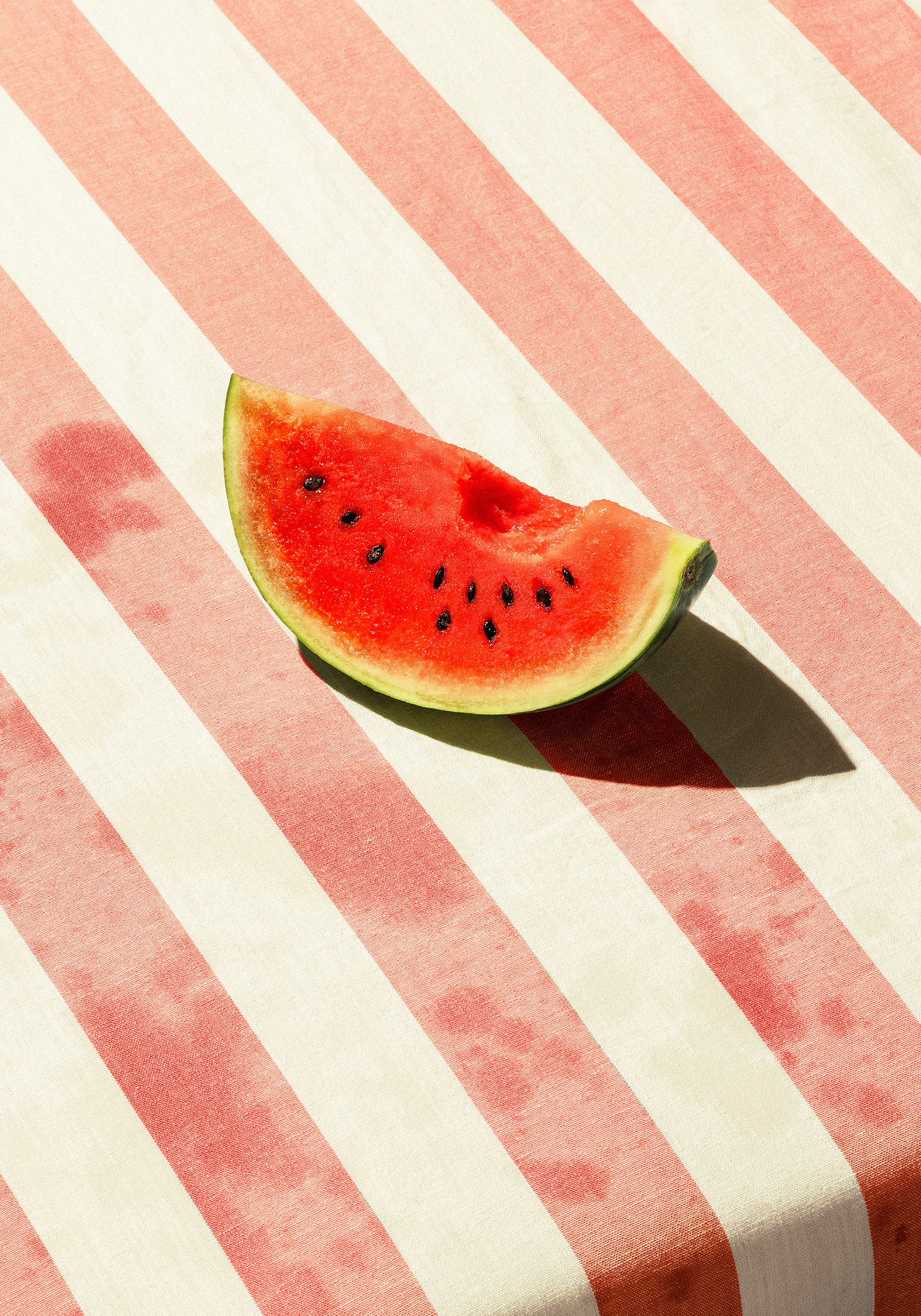 A print of a watermelon slice on a pink and white striped tablecloth. Bright and fresh colours that bring a summery feel to your home.