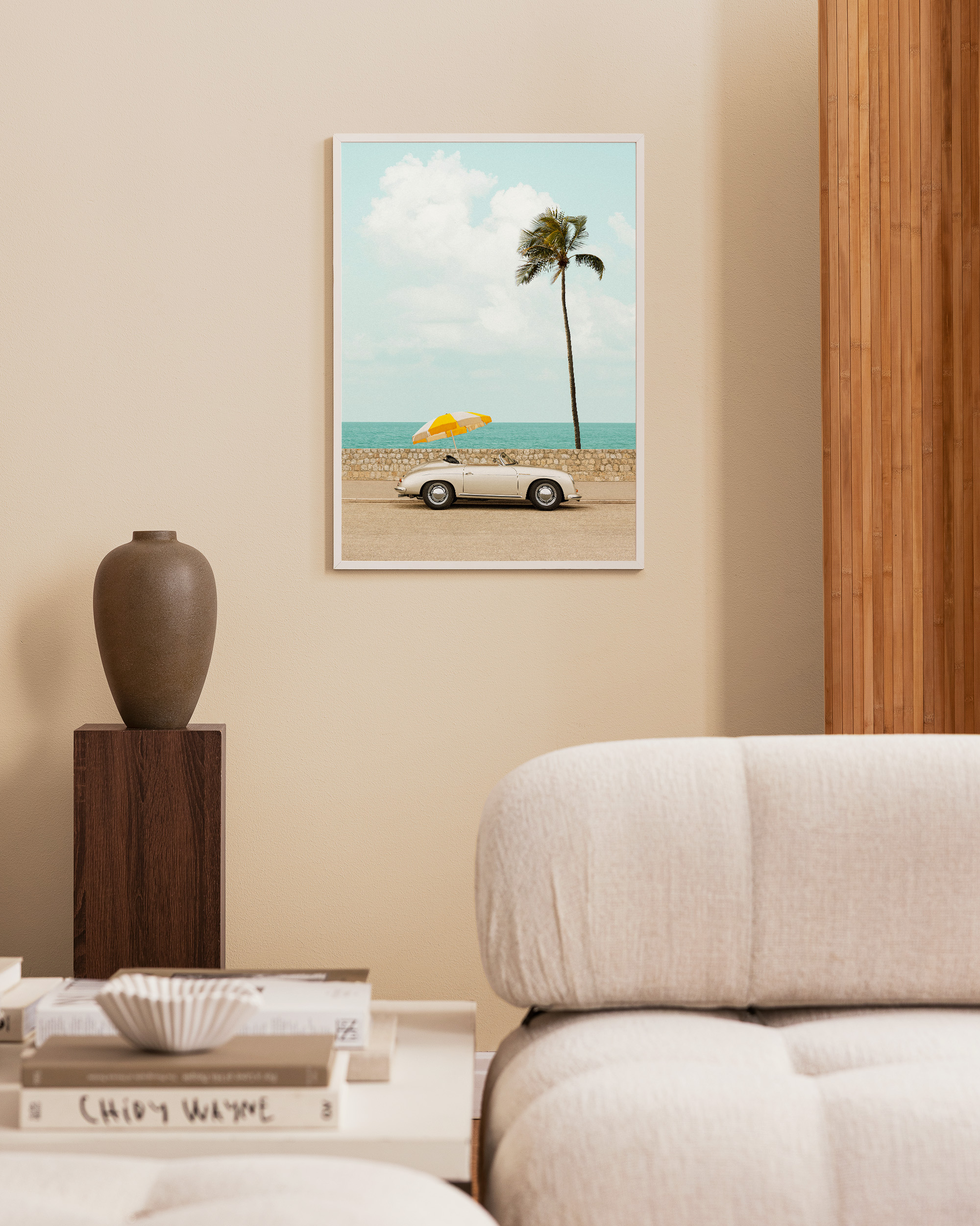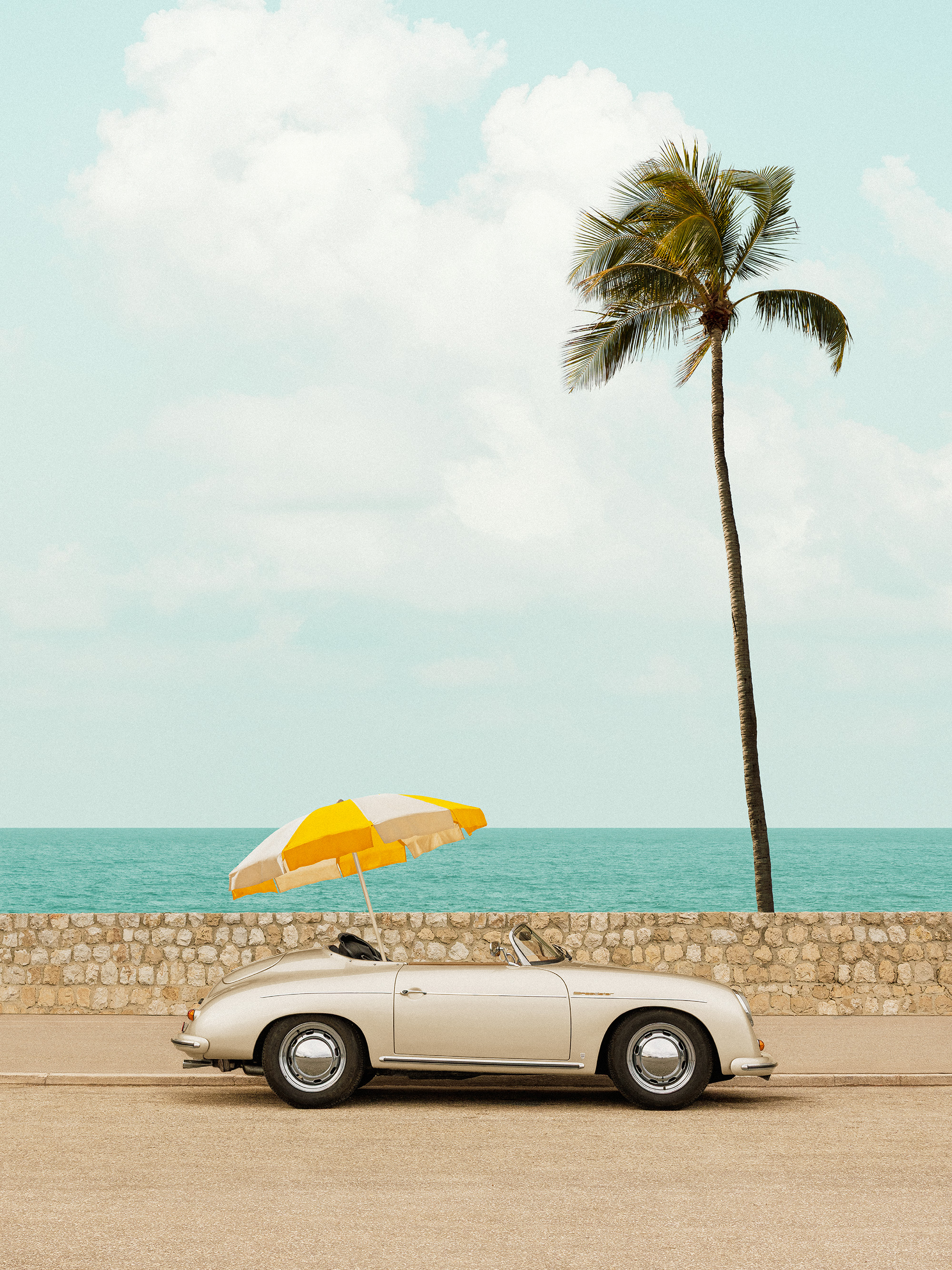 A print of a classic white convertible car parked by the ocean with a yellow and white striped umbrella. Perfect wall art for creating a sunny and relaxed atmosphere.